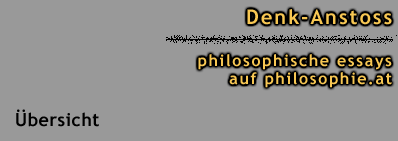 ![]() "Philosophie: Die Suche nach Sinn" >> neu! Die Kunst aus dem (Denk-) Rahmen zu fallen und den Menschen zu entdecken. von Robert Harsieber (Januar 2004) "Megatrend Philosophie?" >> neu! Eine neue Lust macht sich breit: zu philosophieren. Denken ist die hocherotische Essenz unserer Persönlichkeit. Heißt es... von Paolo Reininghaus (Januar 2004) "Utopie Europa" >> Ein Interview der Kleinen Zeitung mit Peter Strasser anlässlich der Euro-Einführung 2002 "Am Start: Ludwig Wittgenstein" >> Werner Zillig erzählt von seiner Begegnung mit einem außergewöhnlichen Philosophen auf einem noch außergewöhnlicherem Plakat... (Februar 2001) << zurück zur homepage |